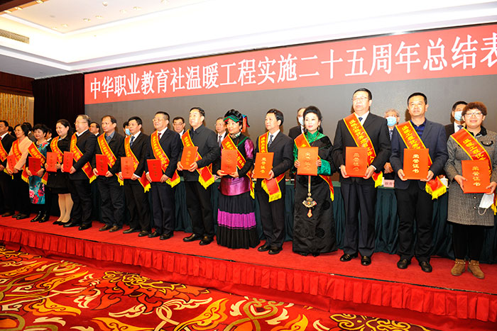 大會期間,中華職業教育社對溫暖工程實施二十五周年的先進集體和先進個人進行了表彰。經逐級推薦、審核評選、網上公示等程序,李兆基基金有限公司等5個單位榮獲溫暖工程最佳公益伙伴獎,天津中德應用技術大學等15個單位榮獲溫暖工程優秀組織管理獎,王偉等20人榮獲溫暖工程優秀項目責任人獎,毛錦鵬等20人榮獲溫暖工程奮斗之星獎,杭州市中華職業教育社等2個單位榮獲溫暖工程項目創新獎。會上,中華同心溫暖工程基金會接受了熱心公益事業企業的捐贈,并向溫暖工程公益大使陳金全、鄒市明、冉瑩穎等頒發了榮譽證書。