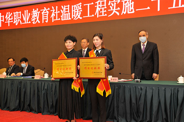 全國人大常委會副委員長、中華職業教育社理事長郝明金,全國政協副主席、中華職業教育社副理事長辜勝阻向溫暖工程項目創新獎獲獎者頒發銅牌